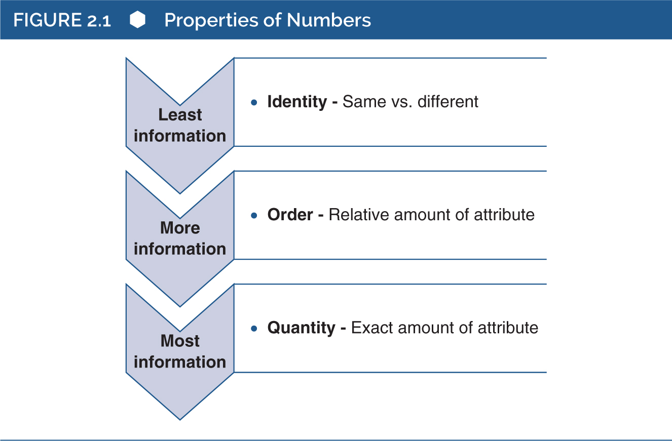Як показано на рисунку 2.1, у цьому розділі викладено три важливі числові властивості, а також розглядається значення нуля. По суті, числові властивості ідентичності, порядку та кількості відображають способи, якими числові позначення можуть представляти потенційні відмінності у психологічних характеристиках. Крім того, нуль є надзвичайно складним числом, і ця складність має наслідки для розуміння різних типів результатів тестів. Наприклад, «результат» у вигляді нуля може мати абсолютно різні значення в різних контекстах вимірювання.